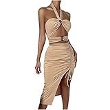 Womens Sexy Cutout Midi Dress Halter Neck Hollow Out Ring Slim Fit Bodycon Dresses Drawstring Slit Y2k Club Party Khaki Read Review