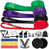 - [Save Money On Gym Fees] - This set is most economical & complete workout bands set in the market, you will save approximately $40 than buying them separately. It includes 4 pull up assistance bands, 3 latex resistance loop bands, 2 double sided core sliders, 1 jump rope, 2 handles with carabiners, 1 door anchor, 1 carrying bag, 1 workout guide. All of them are well tested to ensure qualified standard.