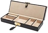 - Heritage Jewelry case - lock & key, 7 jewelry compartments, 1 ring roll, 1 watch compartment, glass mirror, gold finished hardware, black faux leather and ultra-suede lining.