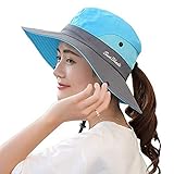 Ponytail Women's Summer Sun Bucket Hats UV Protection Safari Hiking Wide Brim Beach Foldable Mesh Fishing Cap (Sky Blue) Read Review